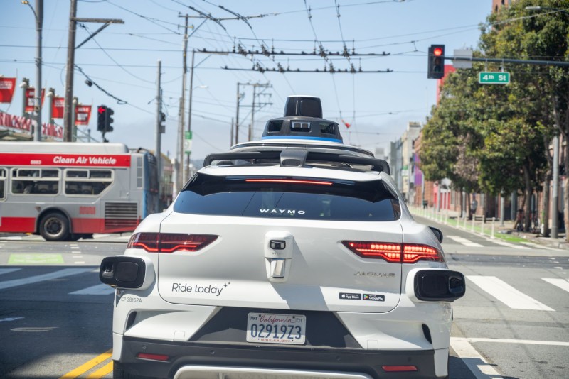 Image: Rear view of Waymo autonomous vehicle stopped at traffic signal with Muni clean air bus in background on 4th Street, San Francisco, California, May 27, 2025. (Photo by Smith Collection/Gado/Getty Images)